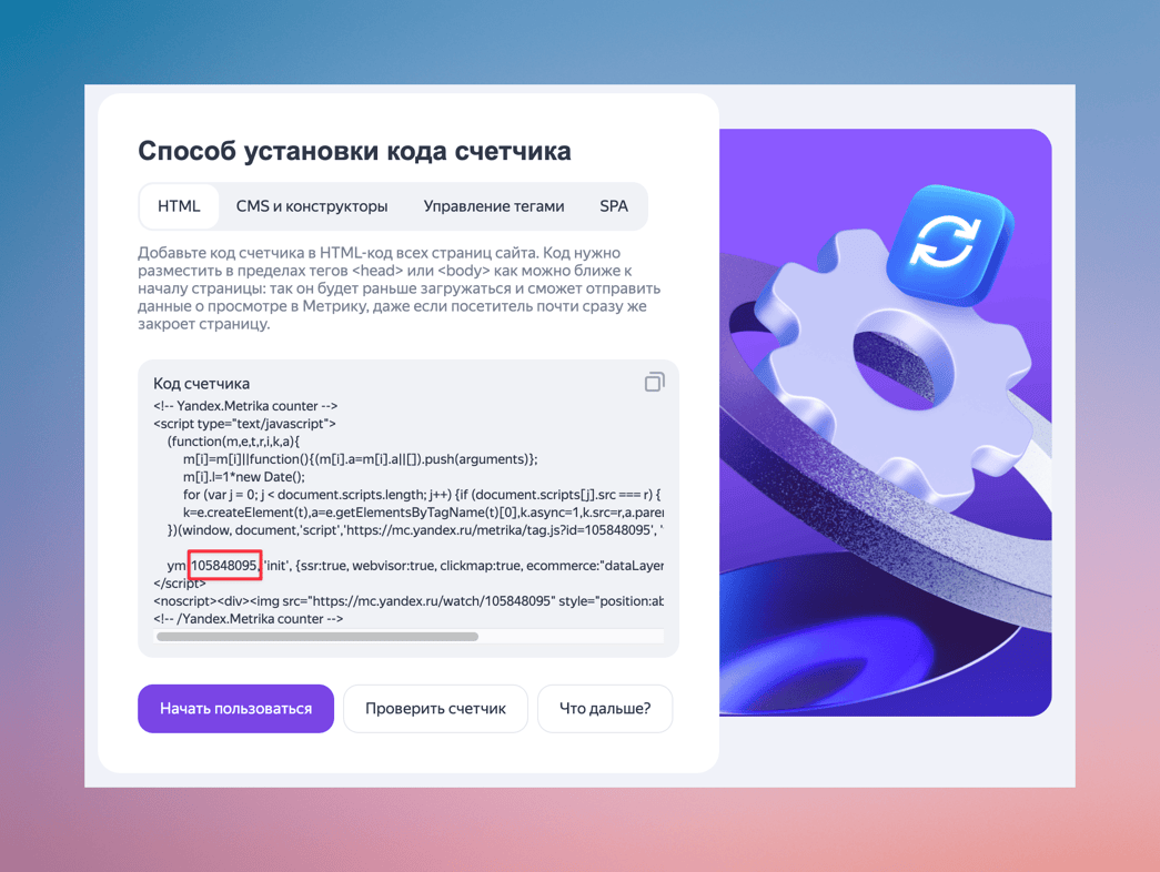 После того, как вы получили код счётчика Яндекс.Метрики, необходимо скопировать оттуда его идентификатор, я выделил его красной рамкой на примере ниже.