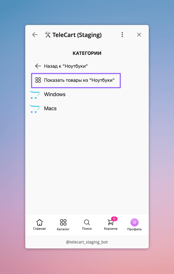 Пример пункта "Показать товары из {категория}" в Каталоге в TeleCart