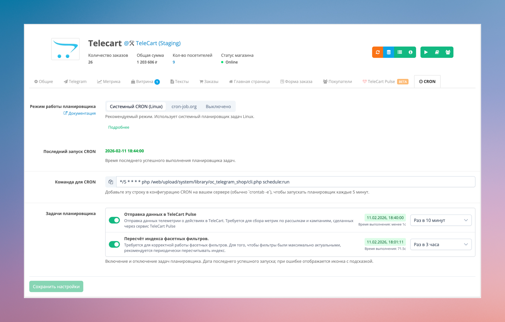 В модуле TeleCart встроен планировщик — он по расписанию выполняет фоновые задачи: например, отправку данных в TeleCart Pulse, обновление кэша, обновление фасетного поиска и фильтров, а также другие административные операции. В новых версиях модуля могут появляться дополнительные фоновые задачи. Чтобы все они работали, планировщик нужно включить и настроить. Эта статья по шагам объясняет, как это сделать.