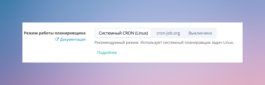 - Режим — выбран ли «Системный CRON» или «cron-job.org», а не «Выключено».