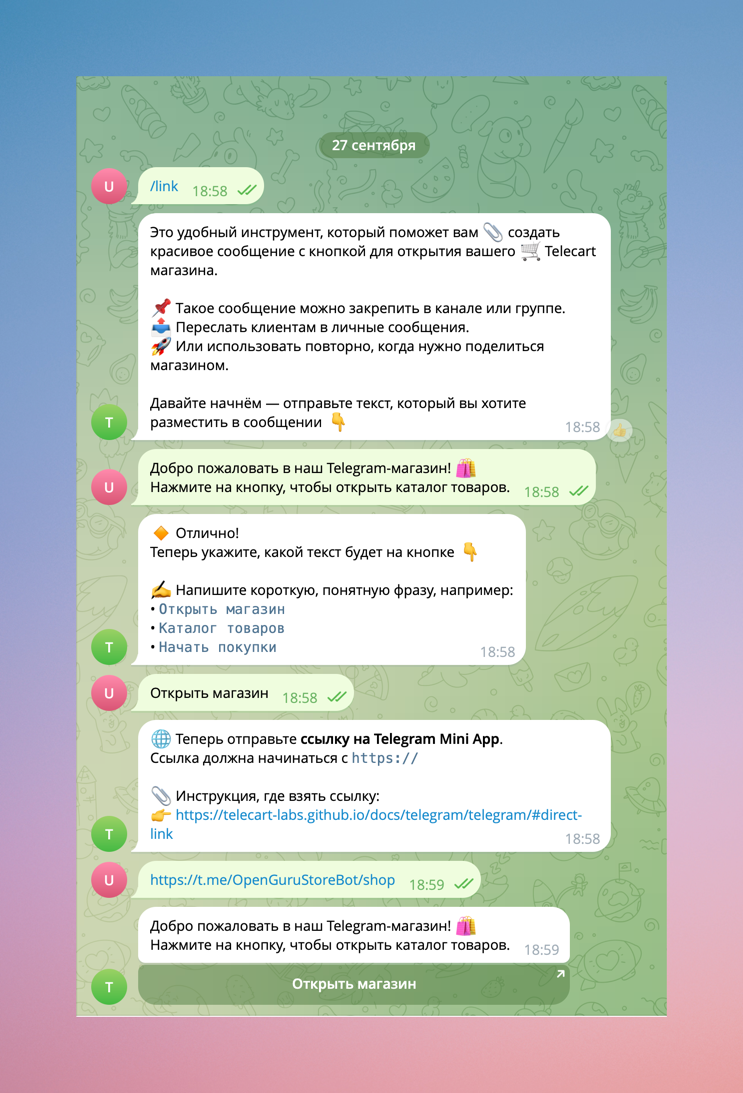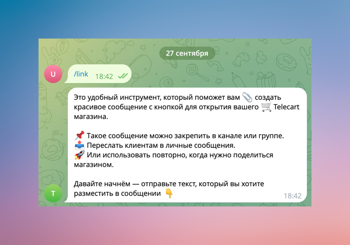 Генератор сообщений с кнопкой для открытия магазина Telecart