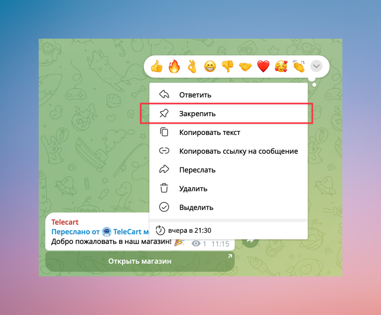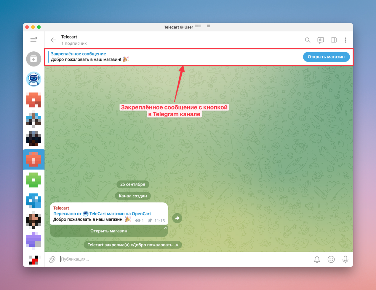 Вариантов на самом деле не так много. В этой статье я расскажу о наиболее удобном, на мой взгляд, способе: закрепить ссылку на магазин в виде сообщения с кнопкой. Такое сообщение будет всегда закреплено вверху канала или группы, и каждый посетитель сможет открыть магазин в один клик.